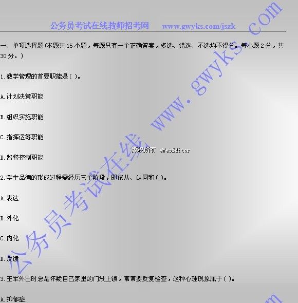 1.A[解析]計劃決策職能是教學(xué)管理的首要職能,是指通過調(diào)查研究,預(yù)測教學(xué)工作和教育發(fā)展的未來,確定教學(xué)管理的政策方向和教學(xué)管理目標(biāo),制定和選擇方案,綜合平衡,作出決策。
