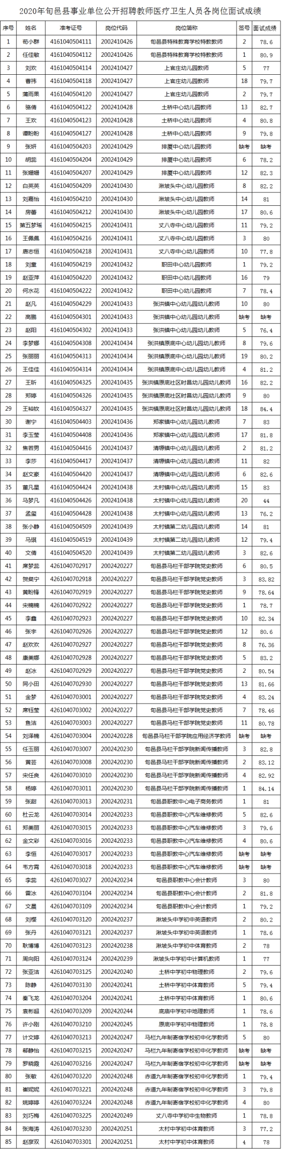 附:2020年旬邑縣事業(yè)單位公開招聘教師醫(yī)療衛(wèi)生人員各崗位面試成績。