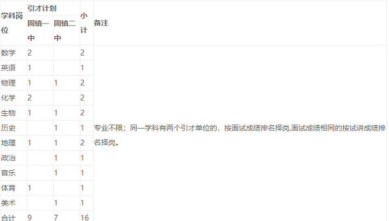本次共引進(jìn)普通高中數(shù)學(xué)、英語、物理、化學(xué)、生物、歷史、地理、政治、音樂、體育、美術(shù)等11個(gè)學(xué)科優(yōu)秀教育人才16名。具體引進(jìn)計(jì)劃如下:
