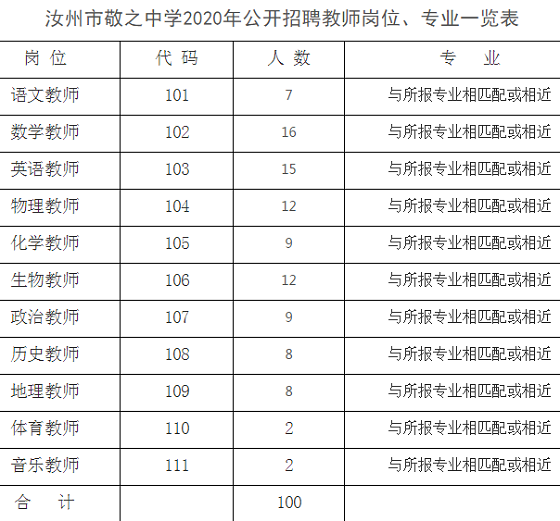 附件:2020年平頂山汝州市敬之中學(xué)招聘教師崗位表