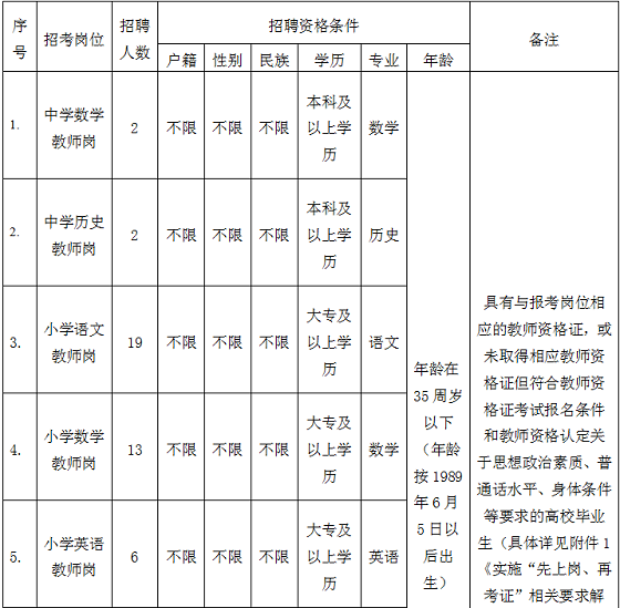 (3)中學教師學歷要求為本科及以上學歷,小學教師學歷要求為大專及以上(已取得畢業(yè)證)。所學專業(yè)與報考學科崗位一致或相關,具有相應的教師資格證書且符合招聘崗位所需要的其他資格條件和要求,或未取得相應教師資格證但符合教師資格證考試報名條件和教師資格認定關于思想政治素質、普通話水平、身體條件等要求的高校畢業(yè)生(具體詳見附件1《實施“先上崗、再考證”相關要求解釋》;