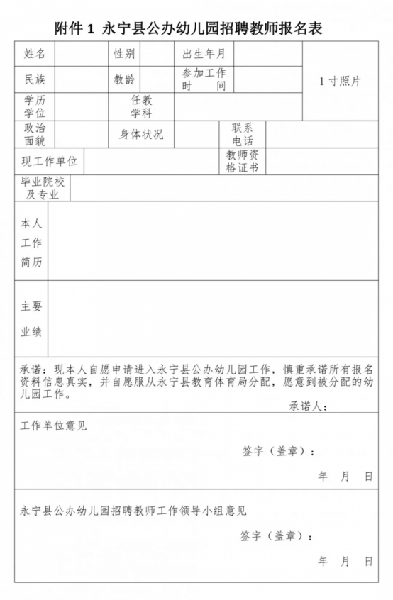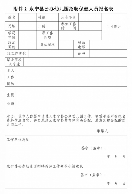 2、應(yīng)聘者填寫(xiě)《永寧縣公辦幼兒園招聘教師報(bào)名表》(附件1)或《永寧縣公辦幼兒園招聘保健人員報(bào)名表》(附件2),并在規(guī)定時(shí)間內(nèi)報(bào)名。