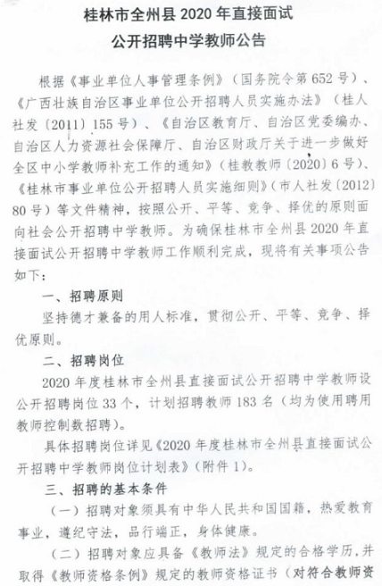 2020年桂林教師招聘 廣西桂林全州縣直接面試公開招聘中學教師【183人】