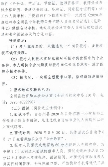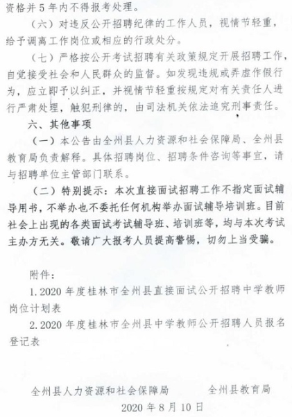 2020年桂林教師招聘 廣西桂林全州縣直接面試公開招聘中學教師【183人】 文武教師溫馨提示:近期文武教師網(wǎng)收到舉報,有詐騙分子發(fā)布虛假信息,進行騙取報名費,如信息中涉及報名收費,請各位老師謹慎鑒別,確認無誤后再繳費報名,以免上當受騙,一般教育局組織的招聘才需要支付費用,學校招聘不需要支付,文武網(wǎng)所提供的所有考試信息僅供參考,敬請考生以權(quán)威部門公布的正式信息為準。