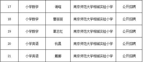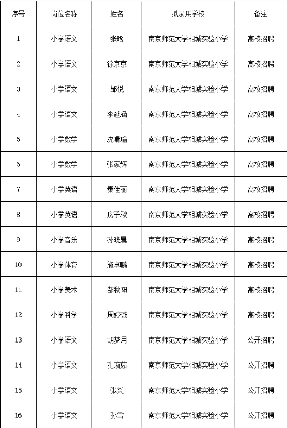 根據(jù)《南京師范大學(xué)相城實驗小學(xué)赴高校公開招聘教師簡章》、《2020年南京師范大學(xué)相城實驗小學(xué)招聘教師簡章》規(guī)定,經(jīng)公開報名、筆試、面試、政審、體檢等程序,擬錄用以下21名同志為相城區(qū)年金制教師,現(xiàn)予以公示,公示時間為7個工作日(8月12日—8月20日)。
