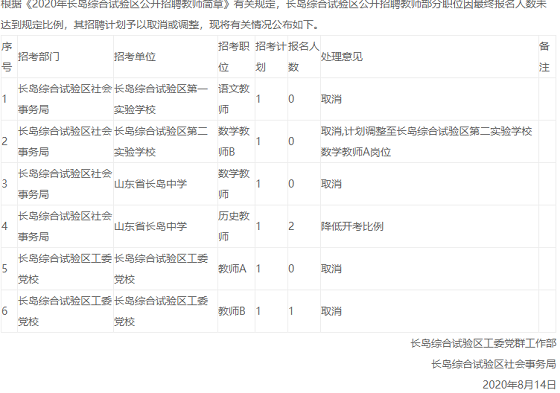2020年煙臺教師招聘 山東煙臺長島綜合試驗(yàn)區(qū)公開招聘教師部分職位招聘計(jì)劃取消調(diào)整公告