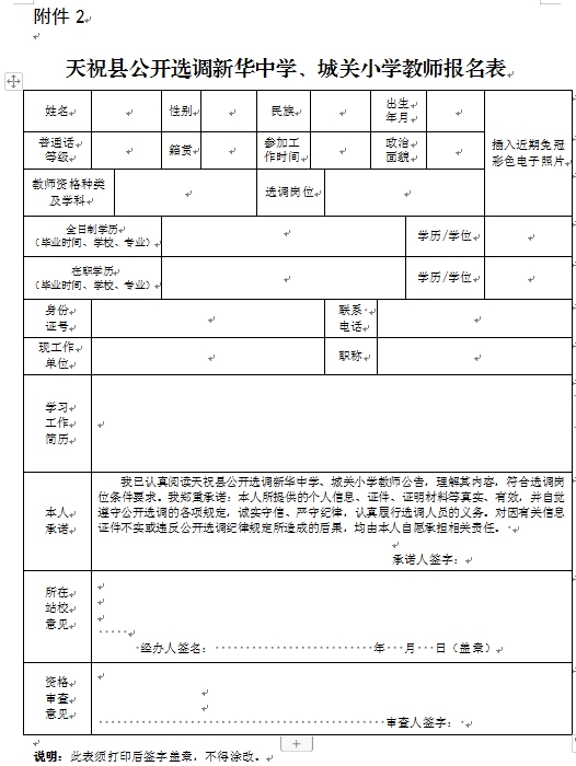 (1)報(bào)考人員填寫《天?h公開選調(diào)新華中學(xué)、城關(guān)小學(xué)教師報(bào)名表》(一式一份,不得涂改),經(jīng)所在站校審核加注意見并蓋章。