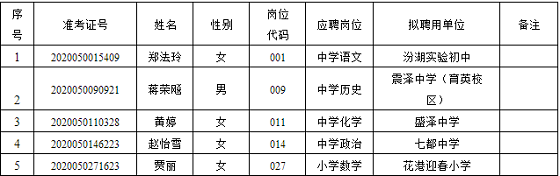 根據(jù)《2020年蘇州市吳江區(qū)教育系統(tǒng)第二次公開招聘教師簡章》,經(jīng)過考試、體檢、考核(政審)等程序,以下擬聘用人員予以公示。