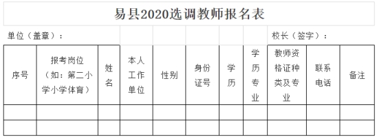 2020年8月26日面向全縣學(xué)校公布選調(diào)實(shí)施方案,同時(shí)進(jìn)行報(bào)名與資格審查。各單位負(fù)責(zé)報(bào)名及資格審查工作。各單位將選調(diào)實(shí)施方案及學(xué)校具體負(fù)責(zé)選調(diào)報(bào)名工作人員聯(lián)系方式通過(guò)學(xué)校微信群等多種形式通知到每位教師(各單位將學(xué)校具體負(fù)責(zé)選調(diào)報(bào)名工作人員聯(lián)系方式、微信群等通知方式截圖于8月26日上午12:00前報(bào)人事股郵箱yxjtjrsg@126.com),做到每位教師都要知曉教體局的選調(diào)方案。同時(shí)選調(diào)方案在教體局微信公眾號(hào)上進(jìn)行發(fā)布。參加選調(diào)教師可以通過(guò)電話等多種形式向?qū)W校報(bào)名(選調(diào)教師可以向教體局人事股直接報(bào)名但同時(shí)須向?qū)W校報(bào)名,報(bào)名人員信息以各單位上報(bào)的為準(zhǔn))。每位教師只限報(bào)一個(gè)崗位(如:第二小學(xué)小學(xué)體育)。各單位于8月27日上午9:00前將《易縣2020選調(diào)教師報(bào)名表》電子版發(fā)人事股郵箱yxjtjrsg@126.com,紙質(zhì)版于8月27日下午5:30前交教體局人事股,紙質(zhì)版要求校長(zhǎng)簽字學(xué)校蓋章。