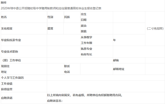 2.接收材料采取現(xiàn)場或網(wǎng)上報(bào)名的方式進(jìn)行。應(yīng)聘者應(yīng)在規(guī)定時(shí)間內(nèi)提交以下材料:(1)《2020年瓊中縣公開招聘初級中學(xué)聘用制教師報(bào)名登記表》(見附件);(2)有效居民身份證復(fù)印件1份;(3)本人近期一寸免冠照片2張;(4)學(xué)歷證書、教師資格證書、職稱證書等復(fù)印件各1份;(5)業(yè)績證明材料和可提供的獲獎(jiǎng)證書、榮譽(yù)證書等復(fù)印件各1份(請完整提供業(yè)績證明材料)。