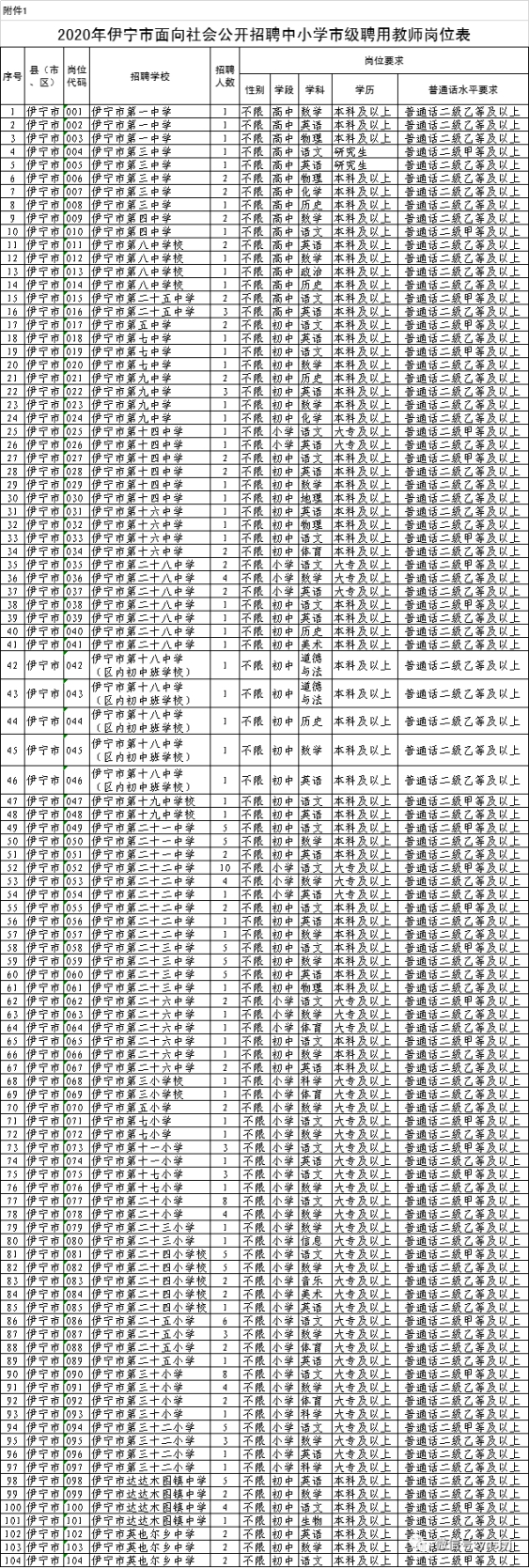附件1:《2020年伊寧市面向社會公開招聘中小學市級聘用教師崗位表》