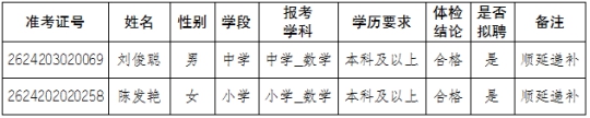 根據《文山州2020年特崗教師招聘公告》《麻栗坡縣2020年特崗教師招聘面試公告》《麻栗坡縣2020年特崗教師招聘綜合成績及擬聘人員體檢事項公告》《麻栗坡縣2020年特崗教師招聘擬聘特崗教師及選崗工作等調整相關事項公告》規(guī)定,因體檢不合格1人,自愿放棄擬聘資格1人,順延遞補2人,F(xiàn)將順延遞補人員名單公告如下: