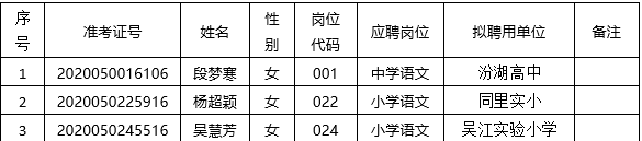 根據(jù)《2020年蘇州市吳江區(qū)教育系統(tǒng)第二次公開招聘教師簡章》,經(jīng)過考試、體檢、考核(政審)等程序,以下擬聘用人員予以公示。
