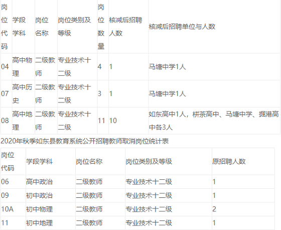 2020年秋季如東縣教育系統(tǒng)公開招聘教師核減崗位統(tǒng)計表