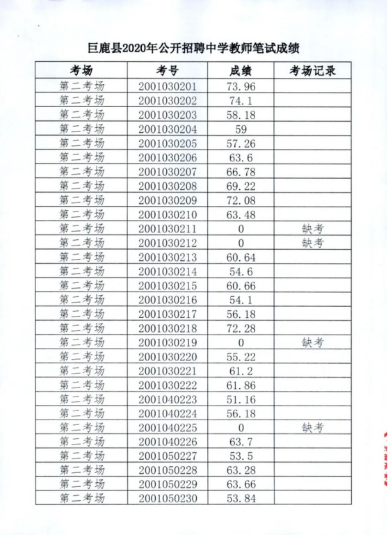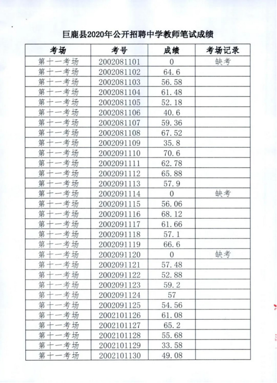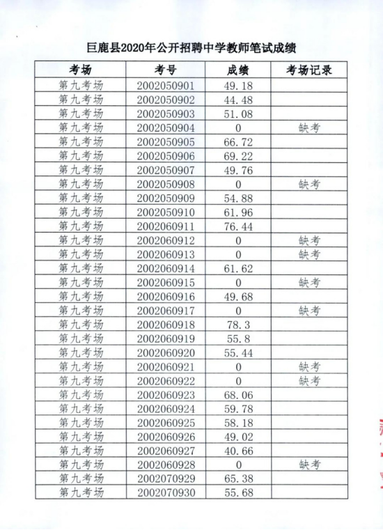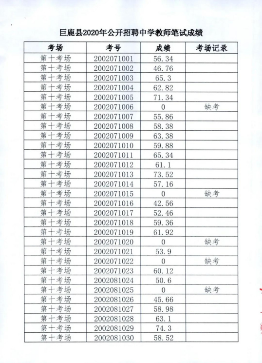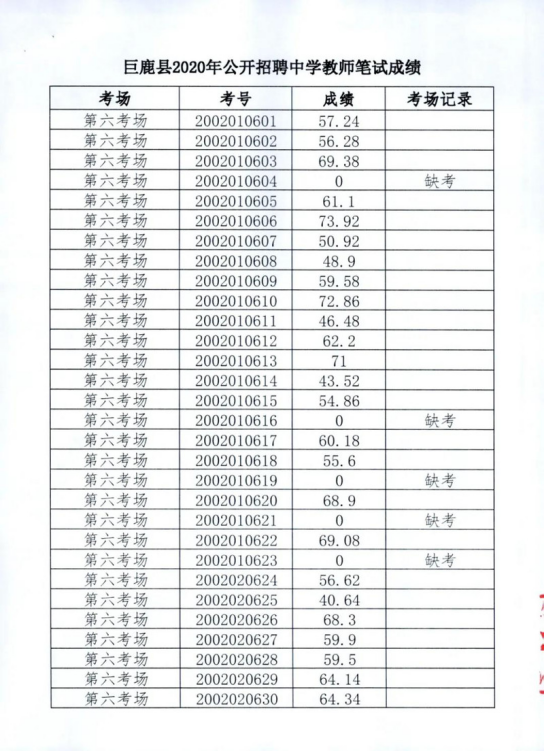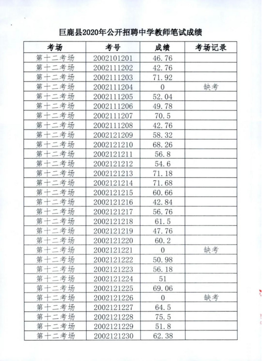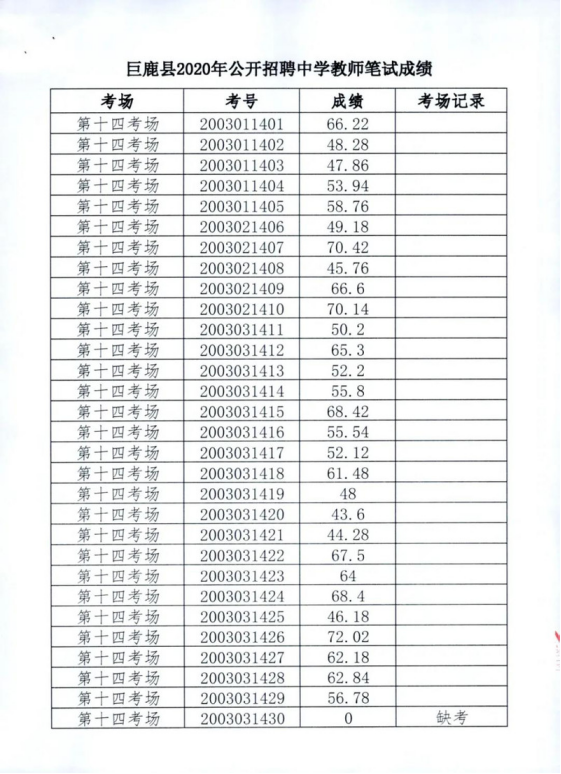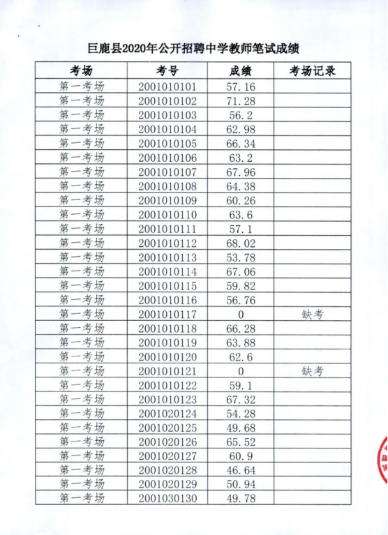河北邢臺巨鹿縣2020年公開招聘中學(xué)教師筆試成績公示