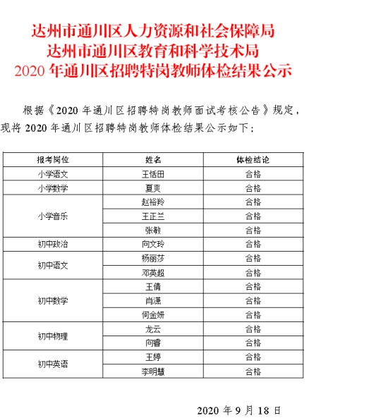 四川達(dá)州市通川區(qū)2020年招聘特崗教師體檢結(jié)果公示