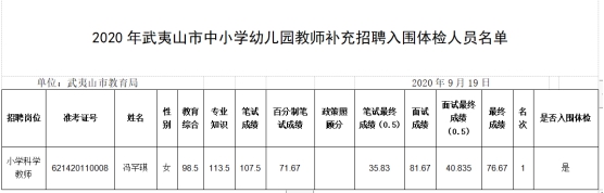 福建南平武夷山市2020年中小學(xué)幼兒園教師補(bǔ)充招聘入圍體檢人員名單