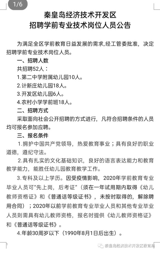 2020河北秦皇島開發(fā)區(qū)招聘學(xué)前專業(yè)技術(shù)崗位人員公告【52人】