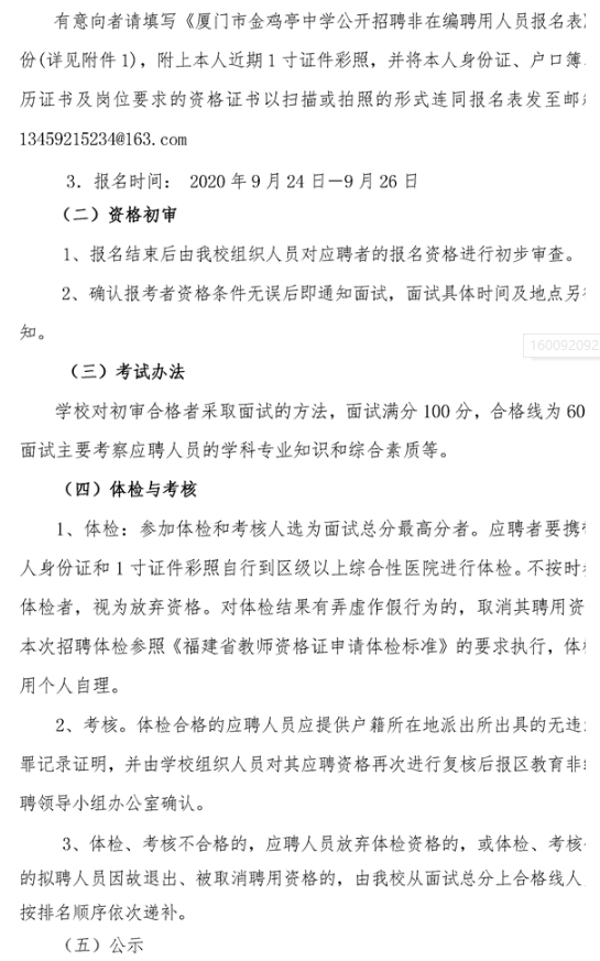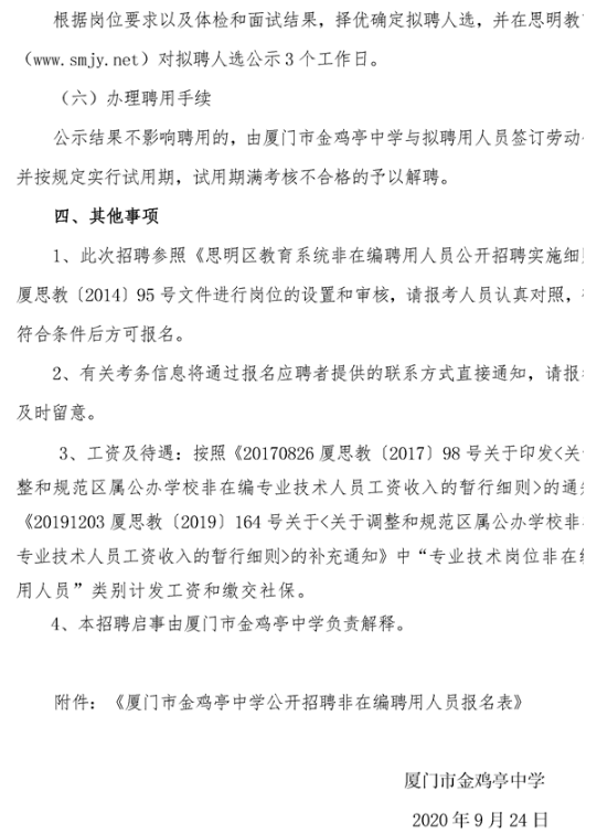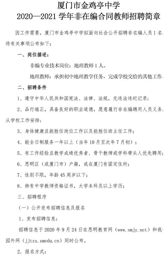 2020廈門教師招聘 廈門市金雞亭中學(xué)2020—2021學(xué)年非在編合同教師招聘簡章(地理1人)