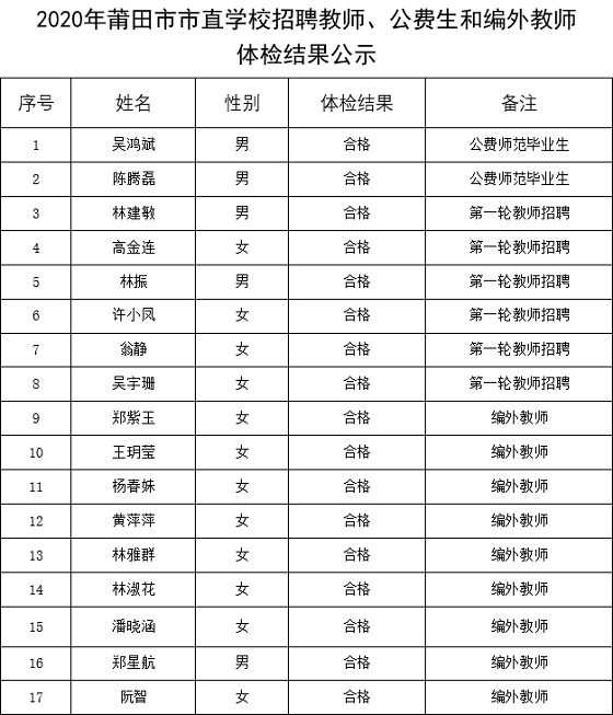 2020年莆田教師招聘 莆田市市直學(xué)校招聘教師、公費(fèi)生和編外教師體檢結(jié)果公示