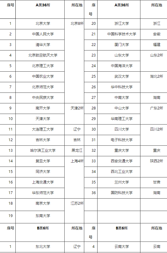 雙一流高校是指:教育部公布的首批國(guó)家雙一流大學(xué)名單中的世界一流大學(xué)建設(shè)高校42所(A類36所,B類6所,見下表)。