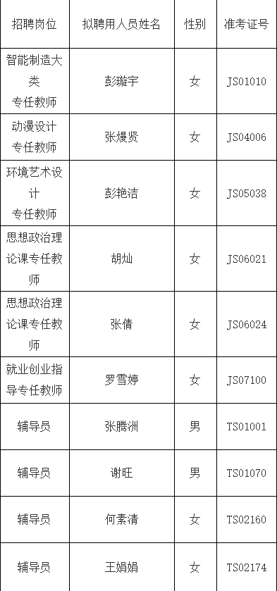 根據(jù)《湖南理工職業(yè)技術(shù)學(xué)院2020公開招聘公告》及有關(guān)規(guī)定,經(jīng)報(bào)名、資格審查、筆試、面試、實(shí)操、試講、體檢、考察等程序,經(jīng)學(xué)院黨委會(huì)研究,確定彭璇宇等10名同志為2020年湖南理工職業(yè)技術(shù)學(xué)院公開招聘擬聘用人選,現(xiàn)予以公示。