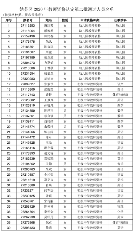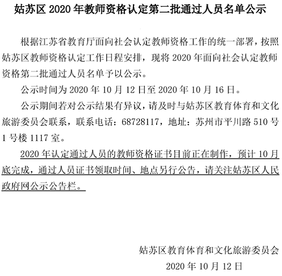 2020年蘇州教師招聘 姑蘇區(qū)教師資格認定第二批通過人員名單公示