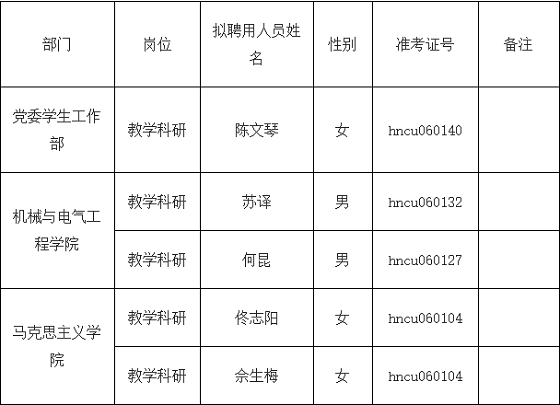 根據(jù)《湖南城市學院2020年公開招聘公告》及有關規(guī)定,經(jīng)報名、資格審查、試講、面試、體檢、考察等程序,經(jīng)學校校長辦公會研究,確定陳文琴等5名同志為湖南城市學院2020年公開招聘A類崗擬聘用人選,現(xiàn)予以公示。