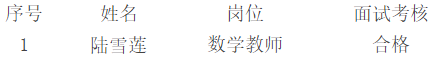 根據(jù)《思明區(qū)教育系統(tǒng)非在編聘用人員公開招聘實施細則(廈思教〔2014〕95號)》及《廈門市前埔南區(qū)小學關(guān)于非在編人員招聘簡章》要求,現(xiàn)將擬聘人員的面試考核結(jié)果公示如下: