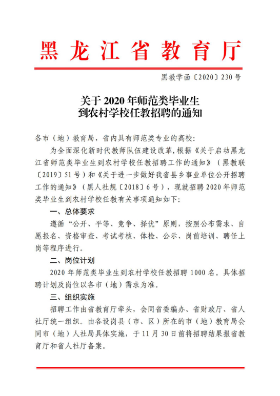 2020年黑龍江省師范類畢業(yè)生到農(nóng)村學(xué)校任教招聘通知【1000人】