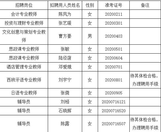 根據(jù)《湖南外貿(mào)職業(yè)學(xué)院2020年公開招聘公告》及有關(guān)規(guī)定,經(jīng)報(bào)名、資格審查、筆試(試講)、面試、體檢、考察等程序,經(jīng)學(xué)院公開招聘工作領(lǐng)導(dǎo)小組研究,確定陳鳳為等11名同志為2020年湖南外貿(mào)職業(yè)學(xué)院公開招聘擬聘用人選,現(xiàn)予以公示。