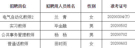 根據(jù)《湖南省汽車技師學(xué)院2020年公開招聘公告》及有關(guān)規(guī)定,經(jīng)報名、資格審查、筆試、面試、試講、體檢、考察等程序,經(jīng)學(xué)院公開招聘工作領(lǐng)導(dǎo)小組集體研究,確定蘭青等4名同志為2020年湖南省汽車技師學(xué)院公開招聘擬聘用人員,現(xiàn)予以公示。