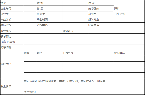 注意事項:1.所填內(nèi)容必須完整真實;2.報考崗位填寫格式為“某某學(xué)科”,如高中語文。