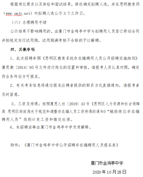 2020年10月福建省廈門市金雞亭中學2020—2021學年非在編合同教師招聘簡章