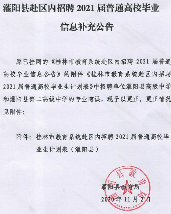 廣西省桂林灌陽(yáng)縣赴區(qū)內(nèi)招聘2021屆普通高校畢業(yè)生信息補(bǔ)充公告