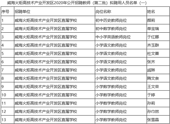 2020年山東省威;鹁娓呒夹g(shù)產(chǎn)業(yè)開(kāi)發(fā)區(qū)公開(kāi)招聘教師(第二批)擬聘用人員公示(一)
