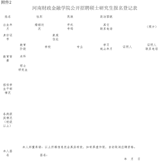 請于河南省招才引智大會期間在鄭州主會場或各線上、線下分會場報名或?qū)⒑啔v發(fā)送至學(xué)校招聘郵箱。碩士研究生應(yīng)聘者需填寫《河南財政金融學(xué)院公開招聘碩士研究生報名登記表》(附件2)。
