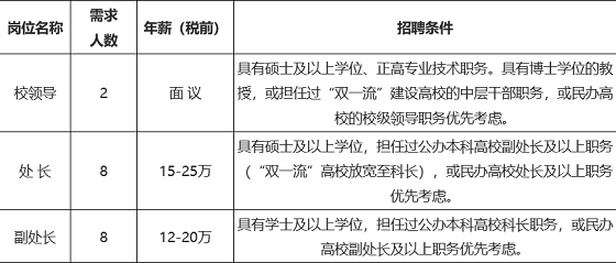 應聘校領導年齡不超過55周歲(1965年1月1日及以后出生)。應聘處長、副處長年齡不超過45周歲(1975年1月1日及以后出生),特別優(yōu)秀和有豐富工作經(jīng)驗者,年齡和學歷可適當放寬。