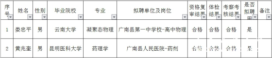 根據(jù)《廣南縣2020年事業(yè)單位公開招聘緊缺專業(yè)技術(shù)人才公告》要求,我縣2020年事業(yè)單位緊缺專業(yè)技術(shù)人才招聘資格復(fù)審、體檢及考察考核分別于11月3日、11月4日、11月5日結(jié)束,F(xiàn)將緊缺專業(yè)技術(shù)人才招聘資格復(fù)審、體檢、考察考核結(jié)果及擬聘用公示如下: