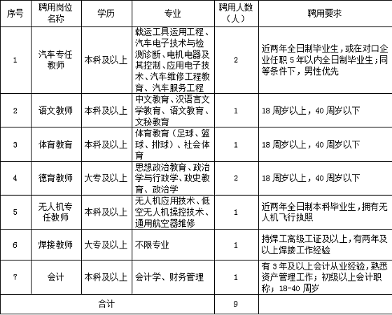 學(xué)校根據(jù)“三年三大步,五年一跨越”的總體目標(biāo),圍繞大交通進(jìn)行專業(yè)布局,所開專業(yè)涵蓋海、陸、空等行業(yè),現(xiàn)設(shè)置有汽車工程系、交通服務(wù)工程系、航海與路橋工程系、機(jī)電工程系、公共基礎(chǔ)部五個系部。汽車運用與維修專業(yè)是我校的國家級重點專業(yè),船舶駕駛、國際郵輪乘務(wù)、道路與橋梁施工工程、體育舞蹈、電梯安裝與維修保養(yǎng)等專業(yè)是我校開設(shè)的柳州唯一或全區(qū)唯一的特色專業(yè)。學(xué)校的發(fā)展目標(biāo)是立足交通辦教育,依托行業(yè)謀發(fā)展,成為行業(yè)特色突出、專業(yè)發(fā)展優(yōu)勢凸顯、在校生規(guī)模6000人左右,社會美譽(yù)度高的國家中等職業(yè)教育改革發(fā)展示范學(xué)校。根據(jù)學(xué)校發(fā)展需要,現(xiàn)面向社會招聘合同制教師,相關(guān)事項公布如下: