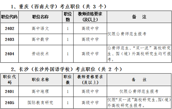 根據(jù)《2021年長沙市教育局直屬學(xué)校引進公費師范生、“雙一流”高校研究生和國(境)外高校研究生公告》(以下簡稱“《公告》”)的規(guī)定,我校本次引進工作在重慶和長沙兩地設(shè)立考點。如重慶考點的空缺職位將納入長沙考點,請關(guān)注11月22日學(xué)校官網(wǎng)公布的補充通知: