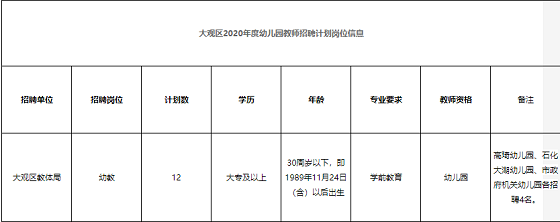 附件:大觀區(qū)2020年幼兒園教師招聘計(jì)劃崗位信息