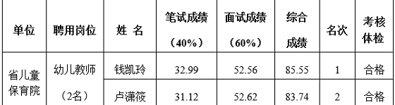 根據(jù)省教育廳、省人力資源和社會保障廳、省委編辦《關(guān)于做好2020年全省中小學(xué)幼兒園新任教師公開招聘工作的通知》(閩教師〔2020〕1號),經(jīng)網(wǎng)絡(luò)報名、資格審核和復(fù)核、筆試和面試、考核和體檢等規(guī)定程序,擬聘用錢凱玲、盧瀟筱2位同志,現(xiàn)予以公示: