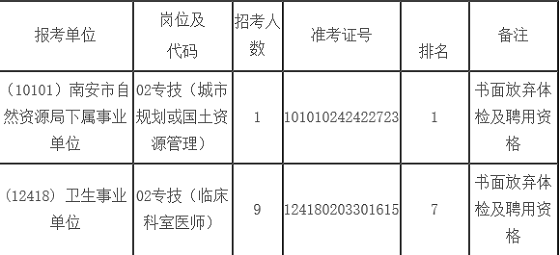 根據(jù)招考公告,考生在資格復(fù)審、體檢等環(huán)節(jié)因不合格或棄權(quán)等原因造成崗位空缺的,在該崗位符合條件的其他考生中按綜合成績從高到低的順序依次等額遞補(bǔ),第一批遞補(bǔ)人員具體名單如下: