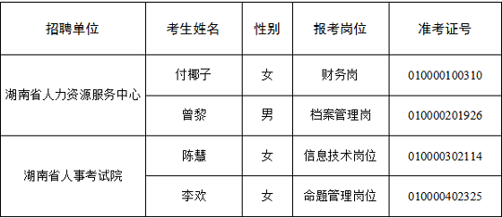 根據(jù)《湖南省人力資源和社會(huì)保障廳直屬事業(yè)單位2020年公開(kāi)招聘公告》有關(guān)規(guī)定,通過(guò)報(bào)名、資格審查、筆試、面試、體檢、考察等程序,經(jīng)廳公開(kāi)招聘領(lǐng)導(dǎo)小組研究,確定付椰子等4名同志為湖南省人力資源和社會(huì)保障廳直屬事業(yè)單位2020年公開(kāi)招聘擬聘用人選,現(xiàn)予以公示
