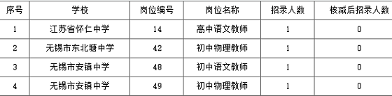 根據(jù)《無(wú)錫市錫山區(qū)教育系統(tǒng)面向2021屆普通高校畢業(yè)生公開(kāi)招聘事業(yè)編制教師公告》規(guī)定,南京師范大學(xué)考點(diǎn)共4個(gè)招聘崗位的報(bào)名人數(shù)未達(dá)開(kāi)考比例人數(shù),經(jīng)研究,報(bào)無(wú)錫市人力資源和社會(huì)保障局核準(zhǔn)后,以下崗位招聘人數(shù)予以核減: