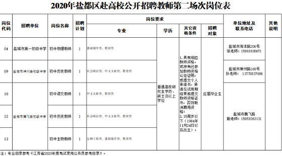 根據(jù)《2020年鹽都區(qū)赴高校公開(kāi)招聘教師公告》規(guī)定,現(xiàn)將第二場(chǎng)次崗位公告如下,具體見(jiàn)《2020年鹽都區(qū)赴高校公開(kāi)招聘教師第二場(chǎng)次崗位表》。