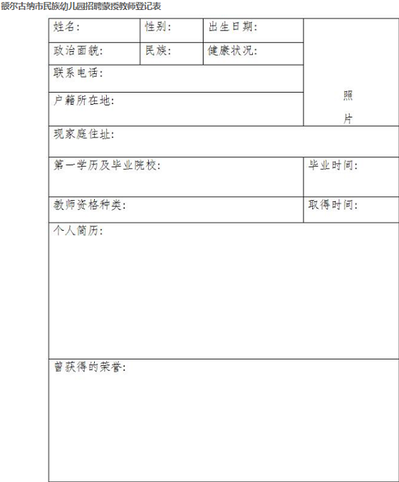 5.《額市民族幼兒園招聘蒙授教師登記表》一式兩份(現(xiàn)場(chǎng)填報(bào))。