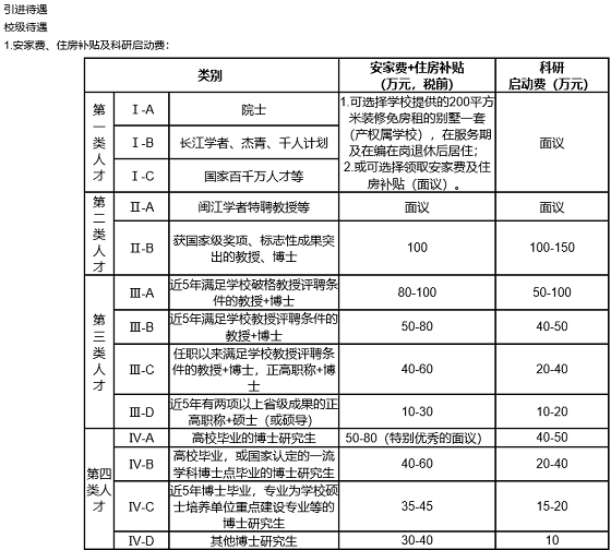2.符合“國(guó)家千人計(jì)劃”、“福建省引進(jìn)高層次創(chuàng)業(yè)創(chuàng)新人才”、“福建省引進(jìn)高層次人才(A、B、C類)”、“福建省閩江學(xué)者獎(jiǎng)勵(lì)計(jì)劃”、“福建青年拔尖人才”等各類人才項(xiàng)目申報(bào)條件的優(yōu)秀人才,學(xué)校給予支持推薦申報(bào),入選后可享受相應(yīng)待遇。