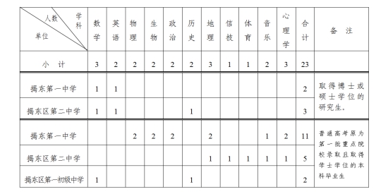 為滿足我區(qū)重點(diǎn)中學(xué)教學(xué)工作需要,建設(shè)一支學(xué)科配套的高素質(zhì)教師隊(duì)伍,經(jīng)揭陽市揭東區(qū)人民政府同意,揭陽市揭東區(qū)人力資源和社會保障局、揭陽市揭東區(qū)教育局決定于2020年12月28日—30日到華南師范大學(xué)設(shè)點(diǎn)開展校園招聘。根據(jù)《廣東省事業(yè)單位公開招聘人員辦法》(廣東省人民政府令第139號)的有關(guān)規(guī)定,現(xiàn)將招聘有關(guān)事項(xiàng)公告如下: